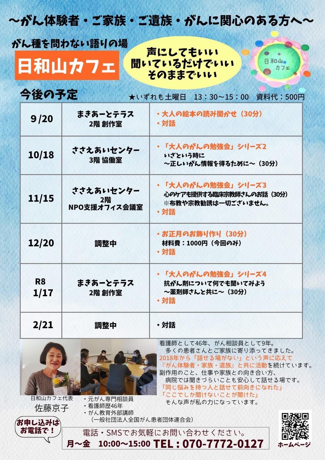 2018年10月には佐藤さん、西村さんが元ちゃんハウスを訪れてくださり、2019年には日和山カフェ1周年記念講演に招かれて「地域でがん体験者とご家族を支える」というテーマで対談し、意見交換もしました。その後もお互いにできる形で活動を続けています。同じような悩みを共有し、「そうそう!」と共感し合いながら「一緒に頑張ろう!」と励まし合いました。