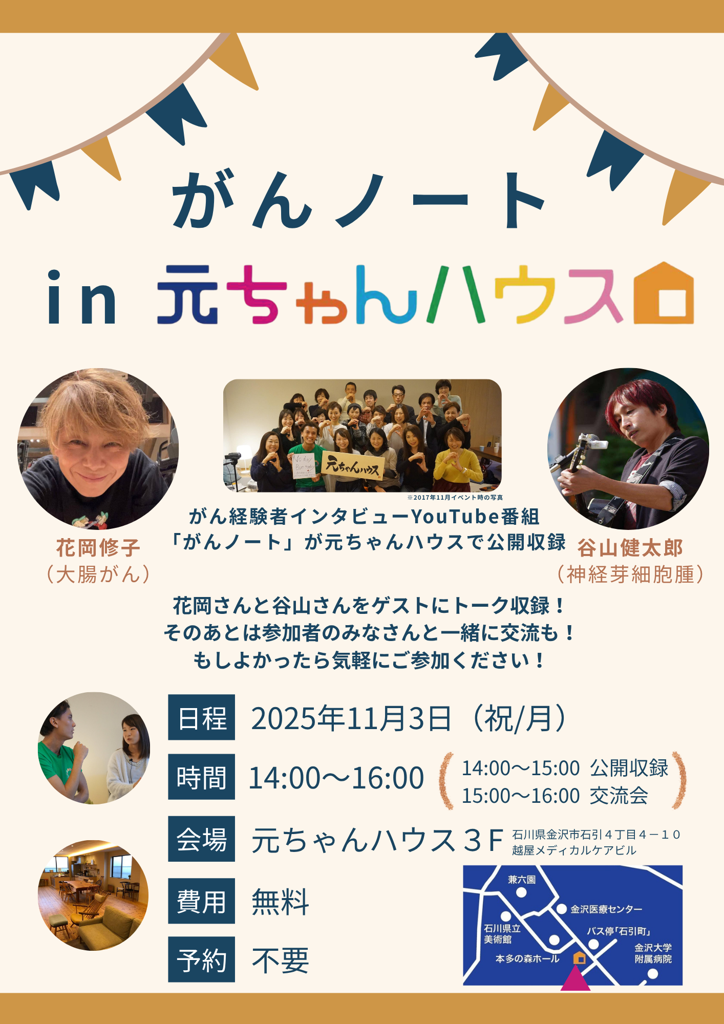 【終了】がんノートin元ちゃんハウス お知らせ 2025.10.262025.11.06 11月3日、元ちゃんハウスでがんノートの公開収録があります。花岡修子さんと谷山健太郎さんのインタビューです。元ちゃんハウスだからこそ聞けるお話がありそうです。そのあとは交流会もあります。元ちゃんハウスにお出かけください。お待ちしております。