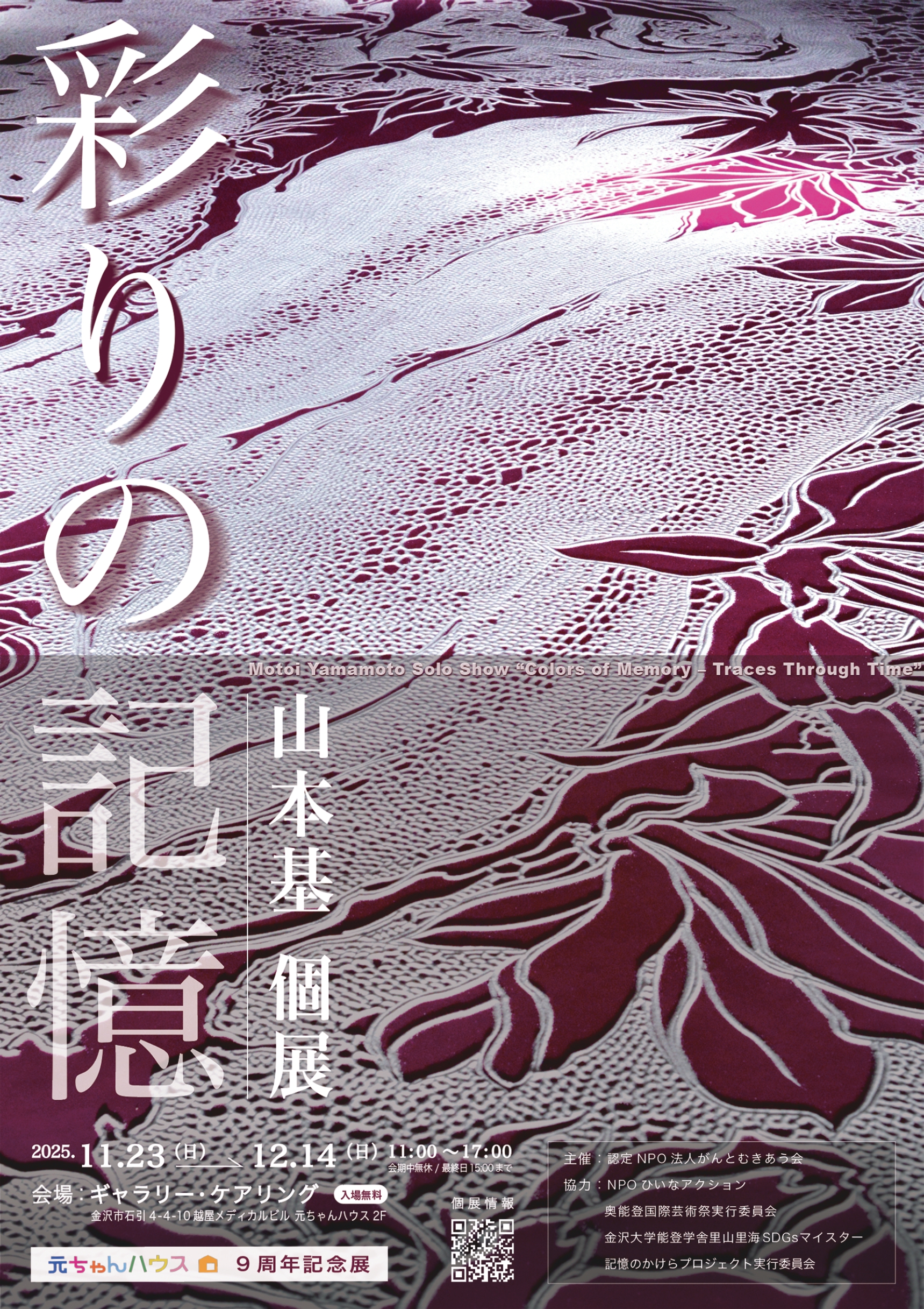 『タイトル:山本基 個展「彩りの記憶」 2018年、私は元ちゃんハウスで紫色の木蓮を塩で描きました。乳がんで亡くなった妻との記憶を、思い出の花に託した作品です。 この秋、元ちゃんハウスは9周年を迎えます。そして私にとっても、妻を見送ってから9年の時が流れました。 塩で描かれた作品は、生まれ、やがて海へ還ります。その自然の営みのように、人の歩みも静かに続いていきます。 昨年の能登半島地震では、私が参加していた奥能登国際芸術祭の会場も被災し、塩の作品が倒壊しました。しかしその欠片は「記憶のかけらプロジェクト」として受け継がれ、参加者が塩を樹脂に閉じ込めてアクセサリーを作るワークショップとして、新たな形へと生まれ変わっています。 本展では、移ろいゆく時と元ちゃんハウスの歩みを重ねた塩の作品、深い秋の空を思わせる青、新たな積層シリーズに加え、塩のスクリーン上に光の線がゆっくりと広がり、やがて静かに消えていくデジタルドローイング作品も展示します。それぞれの軌跡は、記憶が生まれ、やがて消えゆく過程を、そっと映し出してくれるでしょう。 この展示を通して、訪れる人が、移ろいの中にある確かな光と彩りを感じてくださることを願っています。 ※ 本展は、がん患者やそのご家族、そして元ちゃんハウスを支える仲間への感謝と応援の気持ちを込めて企画したものです。 ご希望があれば作品販売も行いますが、その一部は元ちゃんハウスの活動支援のために寄付いたします。』