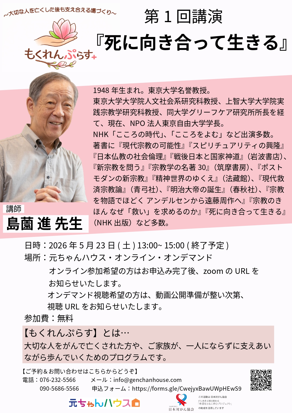 キックオフの第1回は金沢にご縁がある島薗進先生の「死に向き合って生きる」です。もくれんぷらすの事業はご遺族、ご家族のためのプログラムですが第1回のみ、患者さんや医療職、一般の方もご参加いただけます。