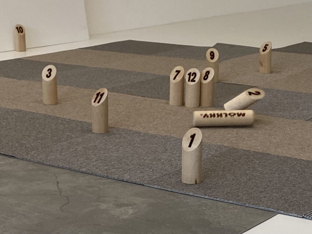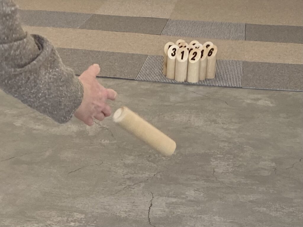 ルール説明から始まり、モルックを投げる、スキットルを点数を考えながら倒す、、それがなかなかうまく倒せない。あららと笑い合っていると、ものの見事に1本倒しでジャスト50点!! 2回戦は調子に乗っているとファール3回で失格!!!