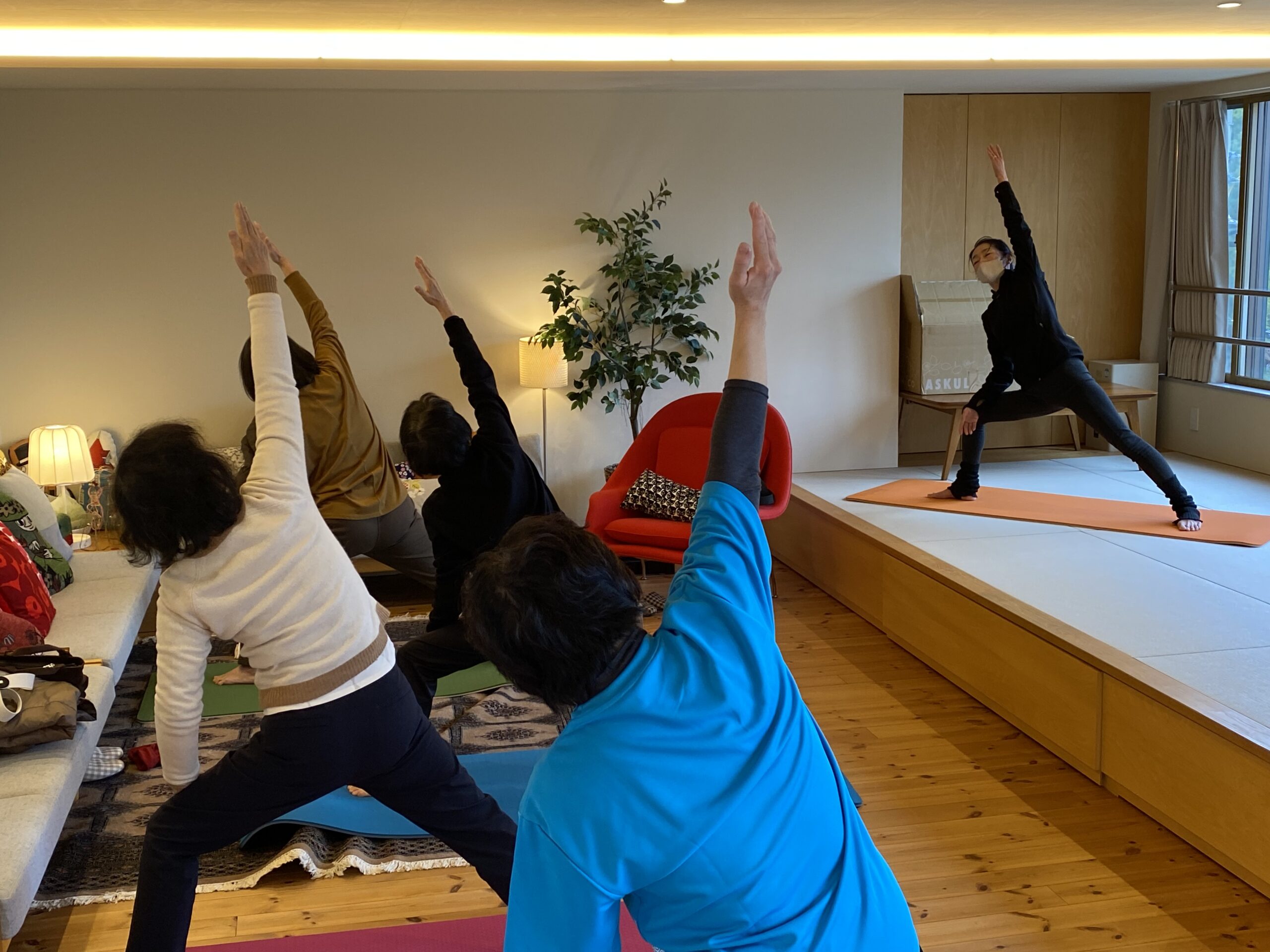 稲穂のポーズや猫のポーズ、英雄のポーズなど側腹部や股関節周囲、下半身のストレッチなどを重点的に行いました。足腰が弱らないように、寒さに負けずに活動を続けていきたいですね。