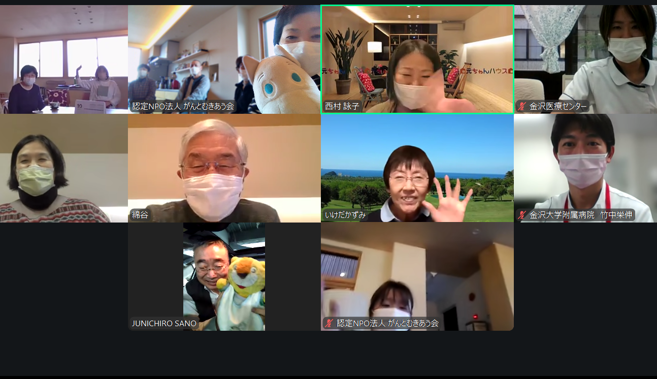 今回の交流会は合計18名の参加がありました。金大附属病院の緩和ケアセンター竹中看護師、金沢医療センターの緩和ケア・治療専門ナース山森看護師も参加してくださいました。