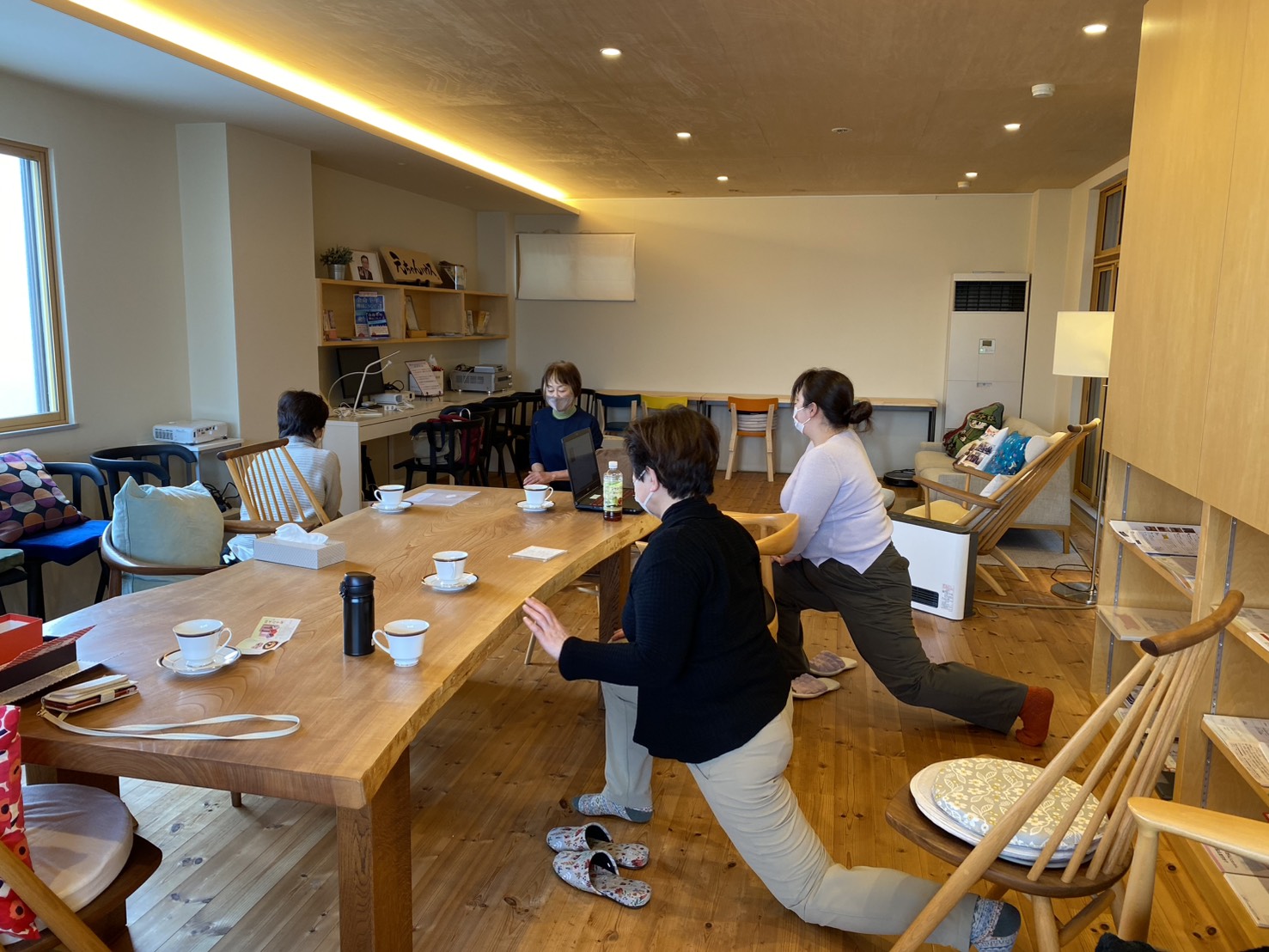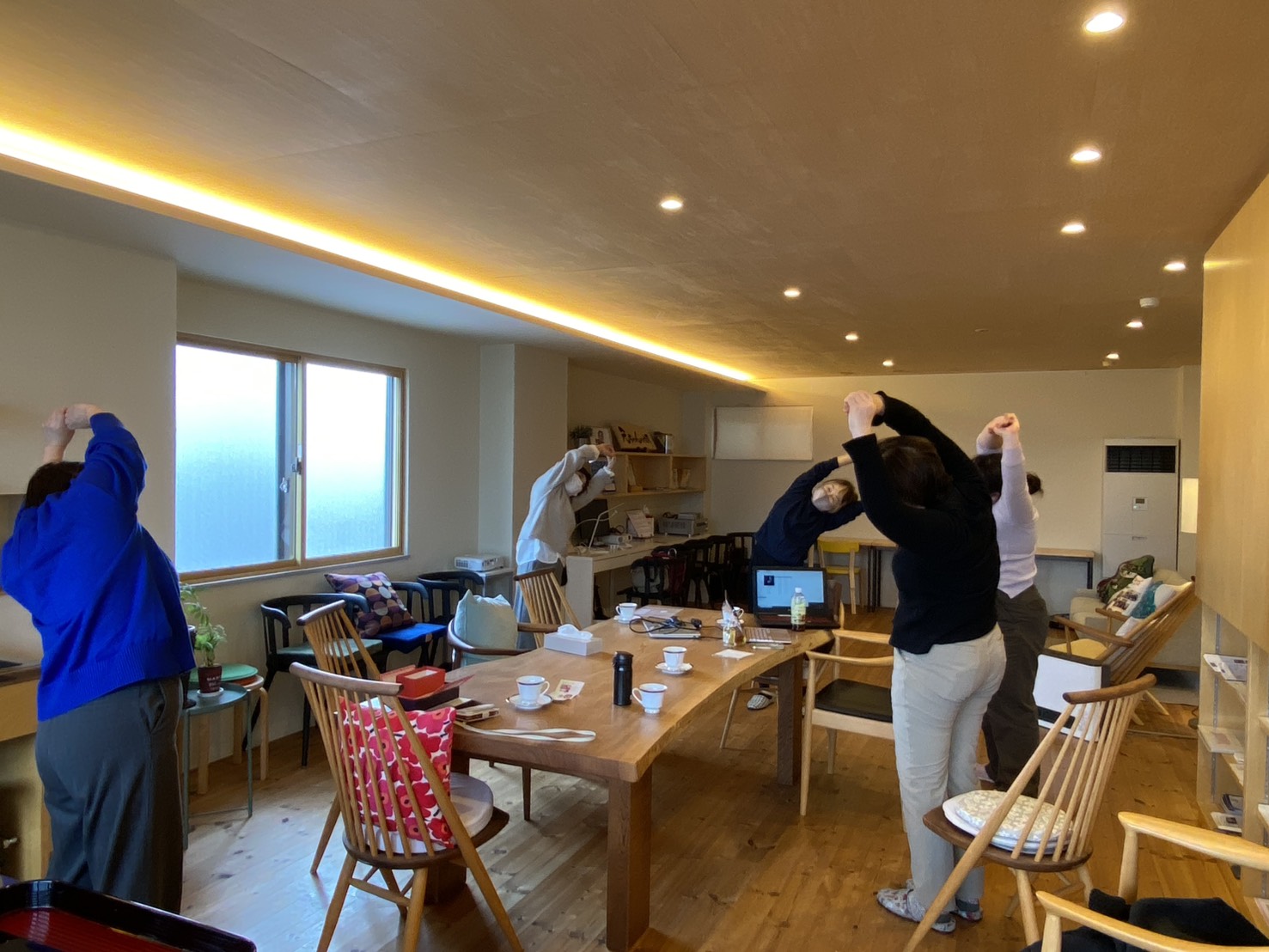 テーブルを囲んだ状態から、立位になり掛け声に合わせてかなりゆっくり深呼吸しながらストレッチしていきました。