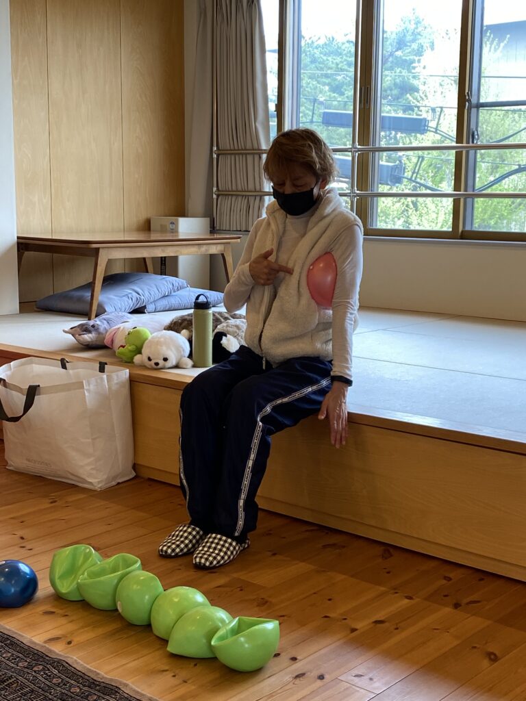 上肢のマッサージから始まり、首・肩周辺・背筋・側腹部を伸ばし、さらにボールを使ってひねりを加え普段使わないような筋肉にも刺激していきます。とてもゆっくりと丁寧に運動していくので、自分でもこの部位が刺激されていると手応えを感じることができました。