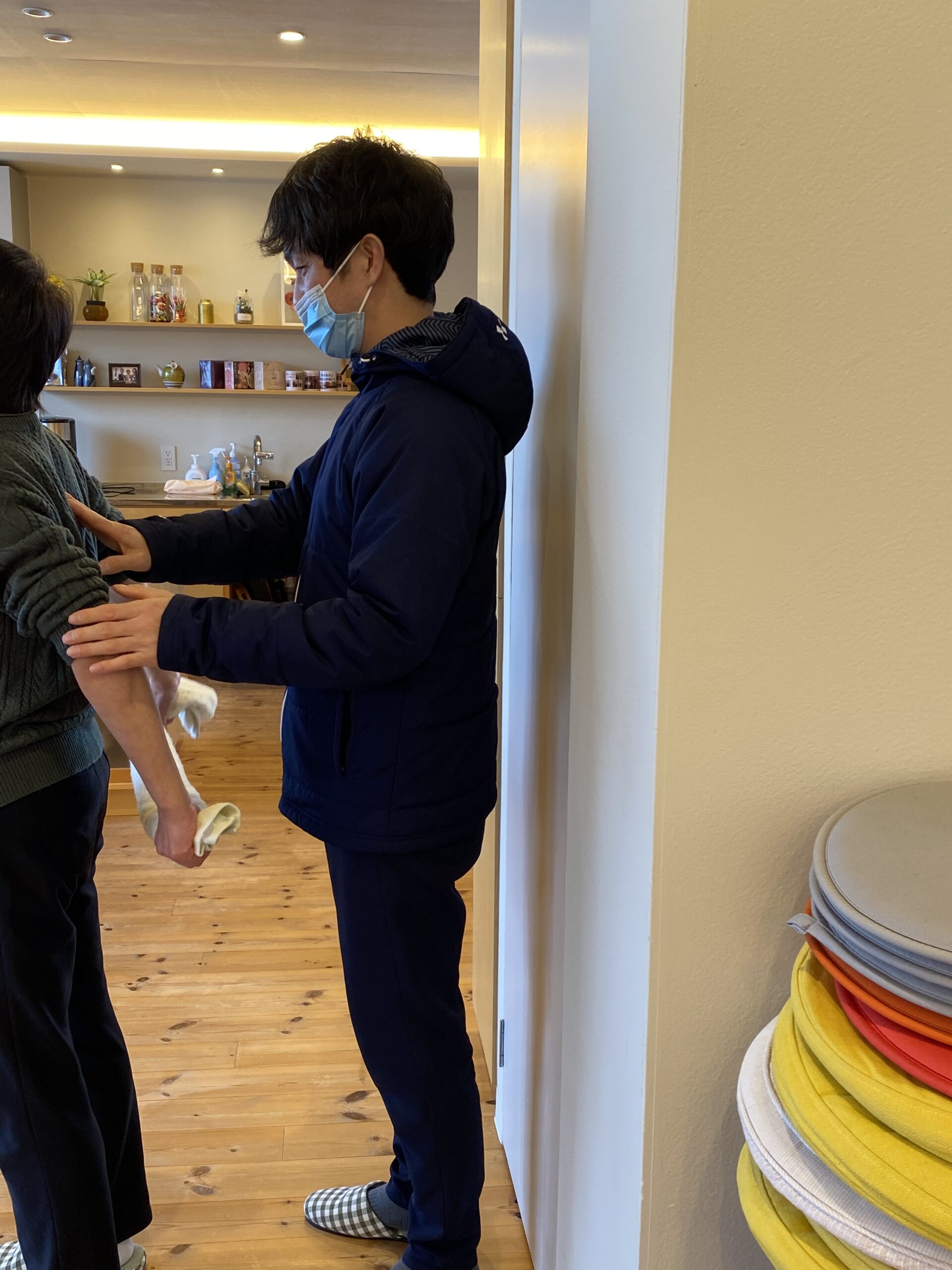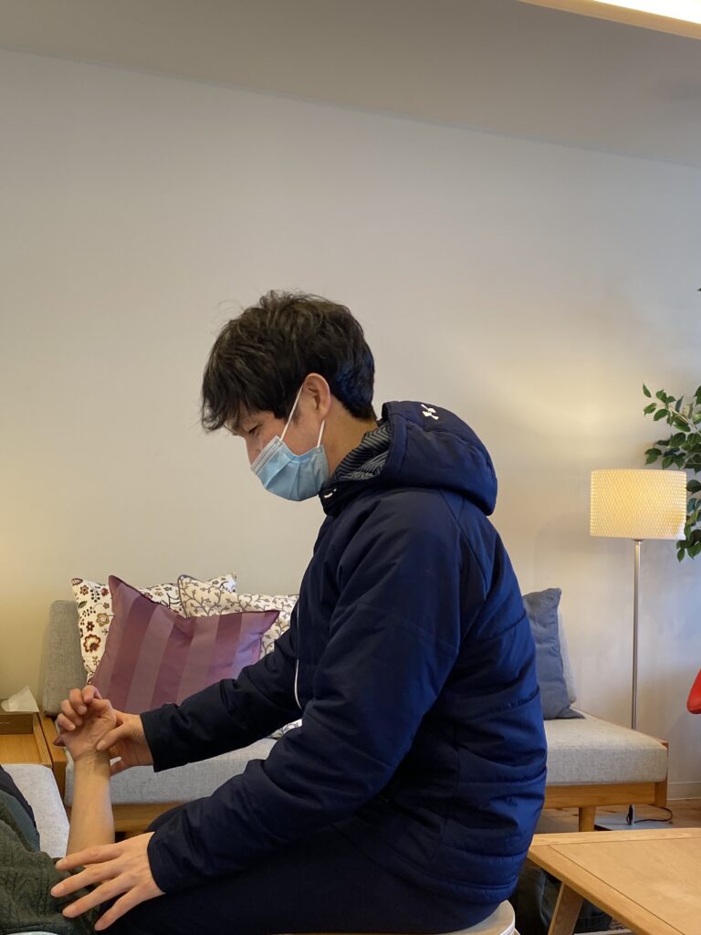 神野さんは、「どこが、どんな風に痛みがあるのか?」「どんな動きをすると痛みを感じるのか?」と丁寧にお聞きしていきます。会話を通して、痛みの原因を探りながら筋肉の緊張をほぐしていきます。痛いと動かさない、余計に固まっていくので少しつづでも動かしながら筋肉をほぐしていくほうが良いと、自宅でも出来るリハビリを教えてくれました。