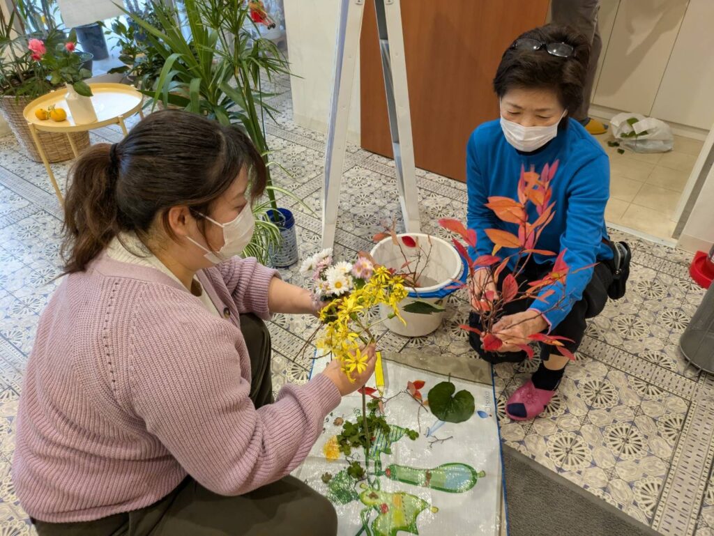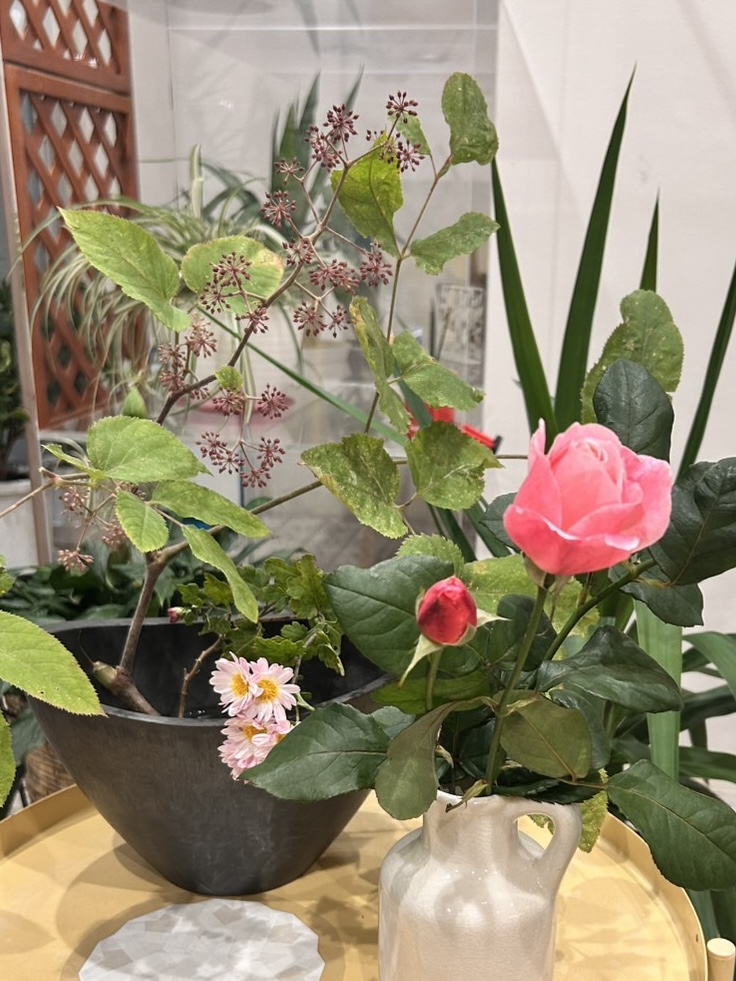 また今日はご近所さんがお花を持ってきてくださいました。バラ、石蕗、小菊など、スタッフが見立てて生けていました。ありがとうございます。(K)