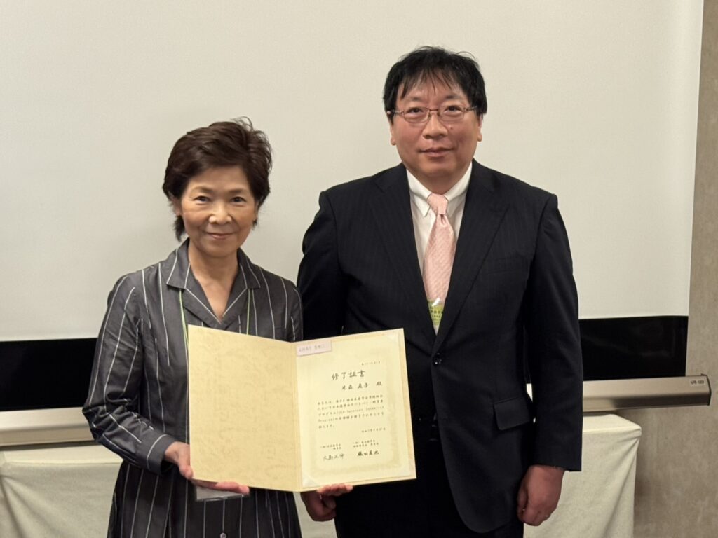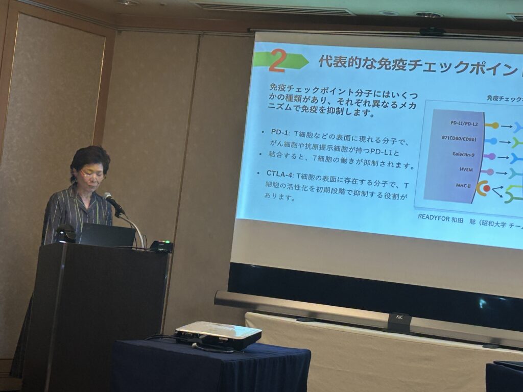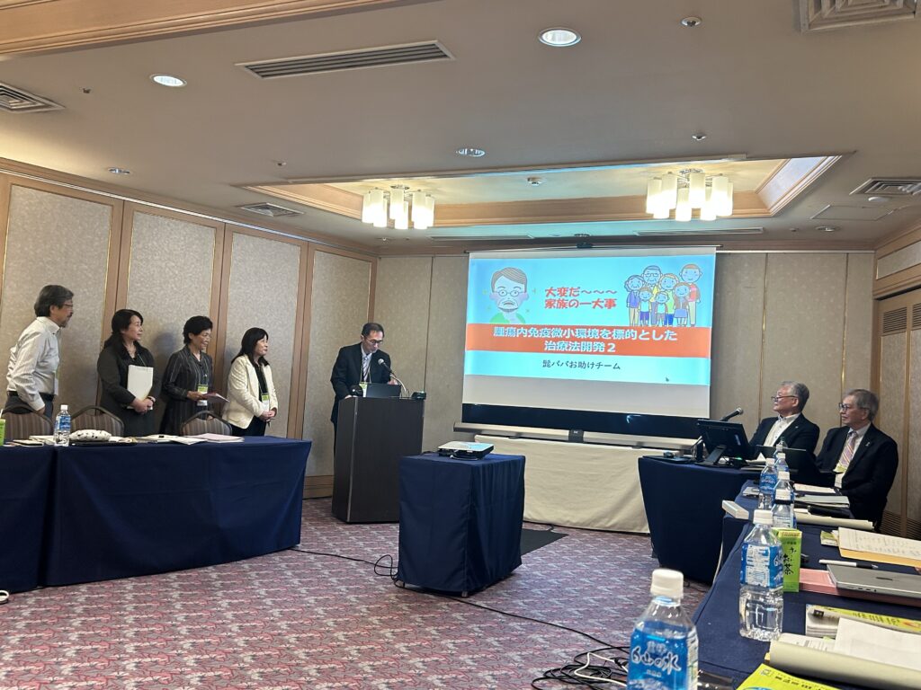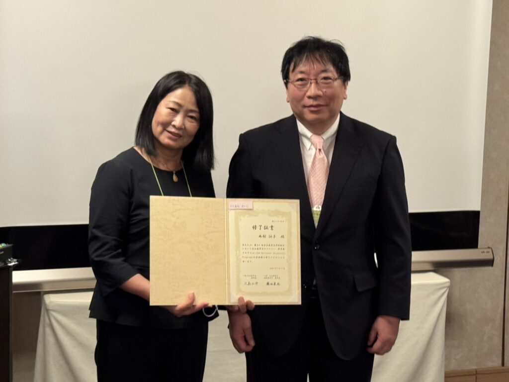 学会のSSPプログラムの目的は「がん研究に対してがん患者や家族の立場から参画する「リサーチ・アドボケート」の養成となります。研究者の先生方とはなかなかお会いすることもありませんが、講義を受けたりいろいろ教えていただく貴重な体験でした。グループワークとして3日間でアドボケートメンターの方のご指導を受けながらテーマについて調べてまとめて最終日には発表をして、そして修了書をいただきました。西村は「がんの早期発見・術後再発の早期予測に向けたがん診断技術の進展」について、そして米森さんは「腫瘍内免疫微小内環境を標的とした治療法開発」についてです。ついていけるか??と不安でしたが、先生方もメンターの方も、そしてグループの先輩方も本当に優しく愛を持って指導していただき、なんとか無事に終了しました。