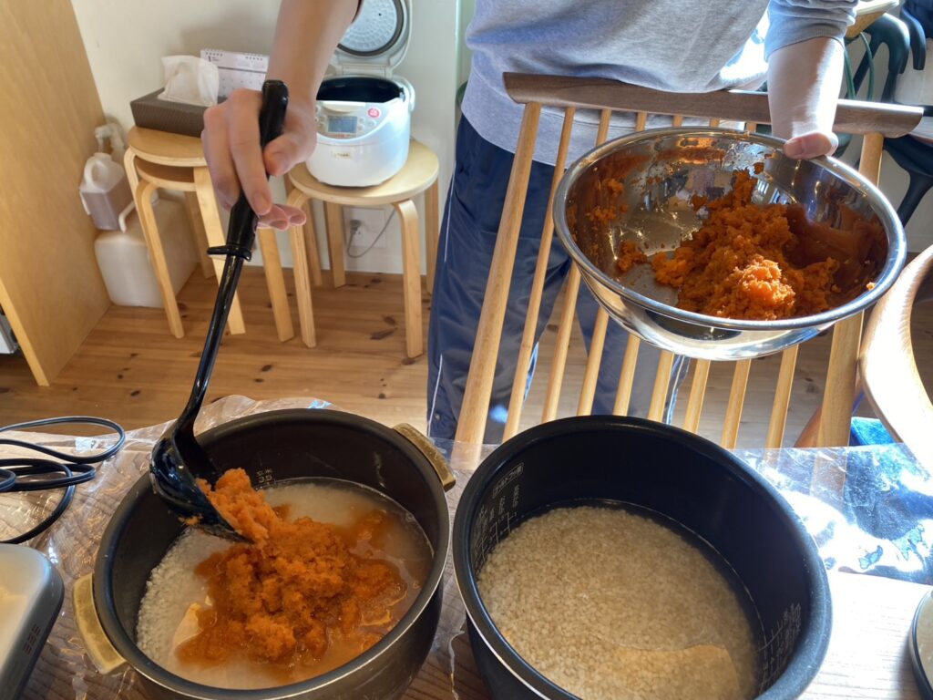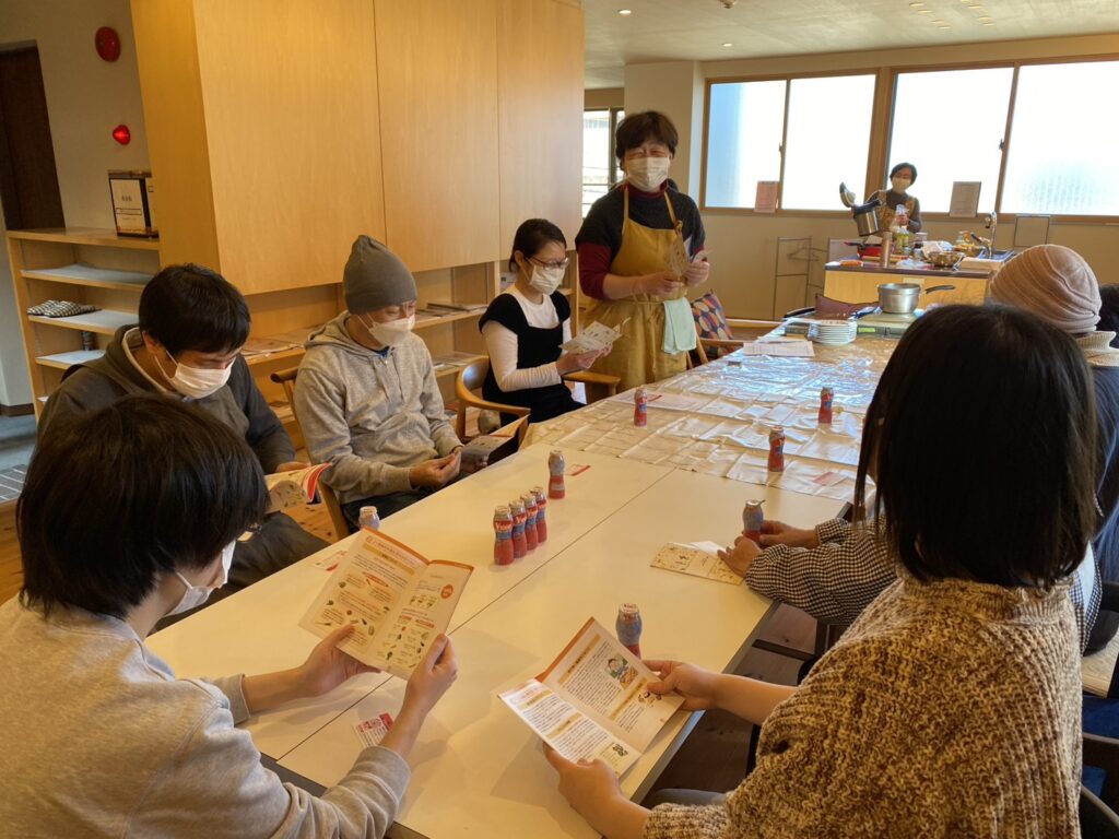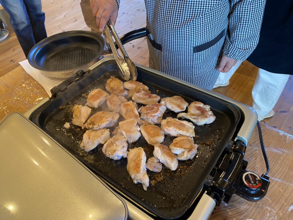苦労してすりおろした人参を2つの釜に分けて炊飯。あとはチキンを焼くところですが、熱々で食べるために時間調整。栄養士会からのキャンペーンで頂いたヤクルト1000のカロリー・糖質オフの紹介と試飲もしました。