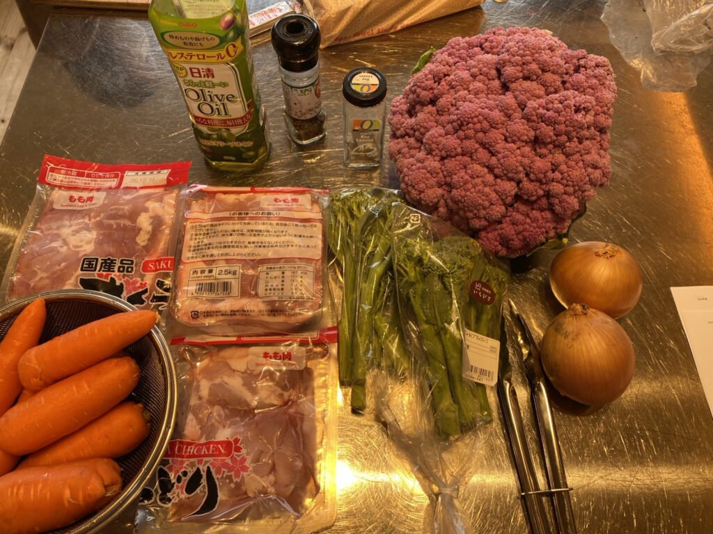 今回は、皮パリパリチキンソテーのバルサミコソース、紫カリフラワーのスープ、にんじんライスを作りました。